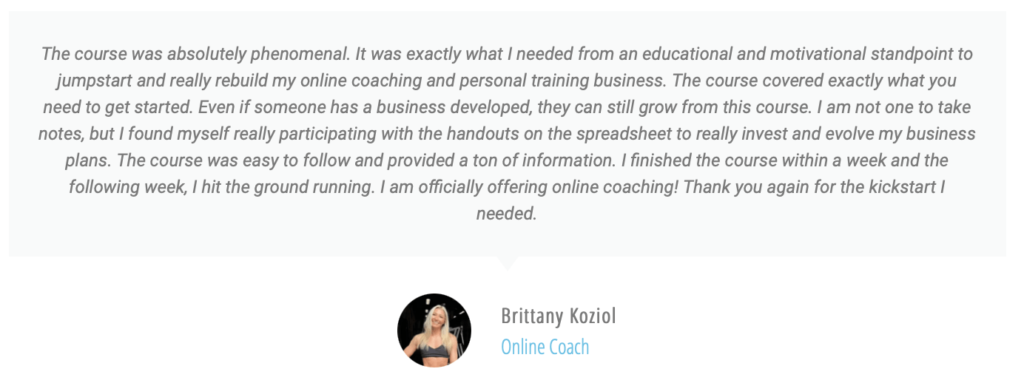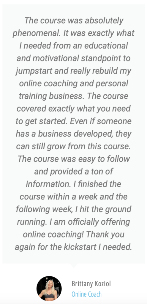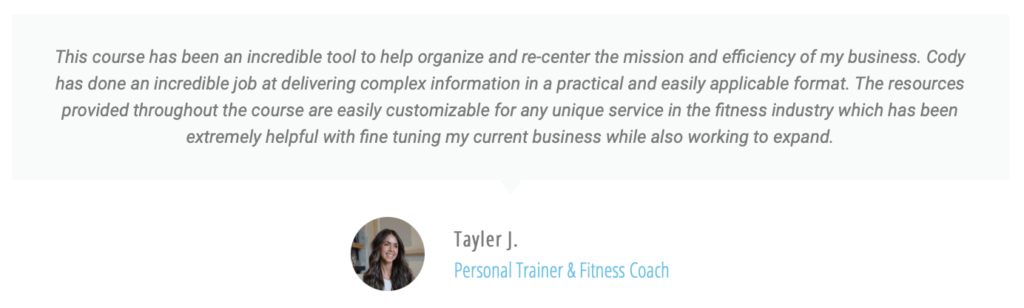 The Business Jumpstart course is for those just starting (or preparing to start) a career in the fitness industry. Or, if you are currently “winging it” and want to set up and streamline your business to run more efficiently. It is designed to get the biggest obstacles out of your way in record time, so you can focus on doing the work that you’re passionate about and being successful while doing it. Rather than spending hours running online searches for annoying business information.